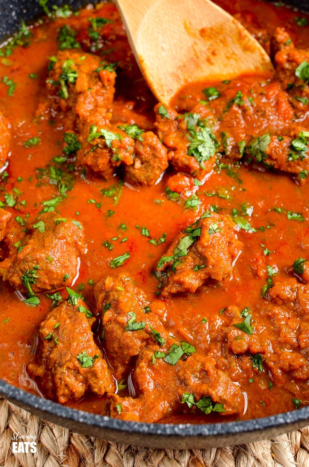 Agneau Fort, Un curry chaud riche avec des oignons, des poivrons, tomates et du piment vert frais.